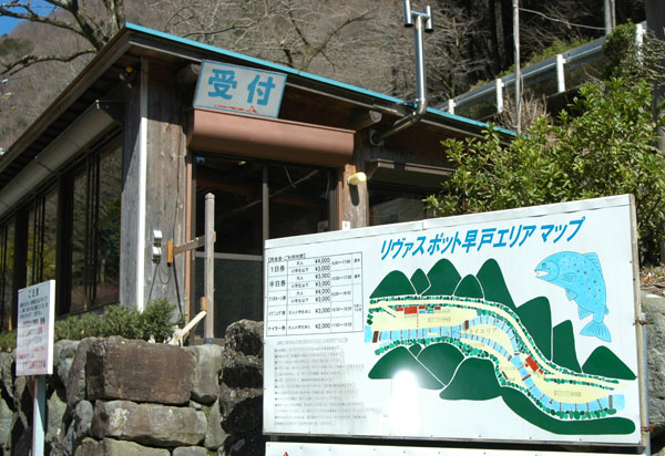 さ、受付で釣りをする前の手続き。元々は自然の川なので漁協への入漁券も発生するらしくそちらが1000円。そして管理釣り場への入場が3000円の合計4000円也。結構高いのね…。でも一日券なので、これで夕方の5時まで釣りが可能。