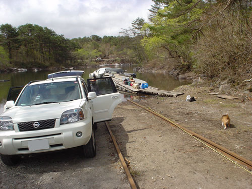 というわけで、夜通し高速を走って、早朝裏磐梯に到着後、時間調整して管理人さんに連絡。「まだ早いですけど、もうチェックインしてもらっていいですよ~。お迎えに行きますので桟橋で待っててください」とウキウキ意気揚々で荷下ろし中で~す!まさか、あんな目にあうとは露知らず…(笑)