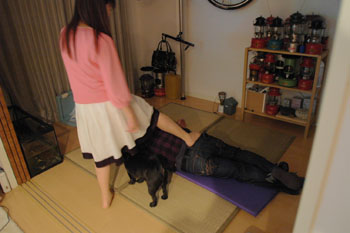 で、↑の画像は、早々にダウンしたダンナOに渇を入れる、やはり出来上がっている奥様の図。kumaが微妙なところに顔を出してます…(汗)